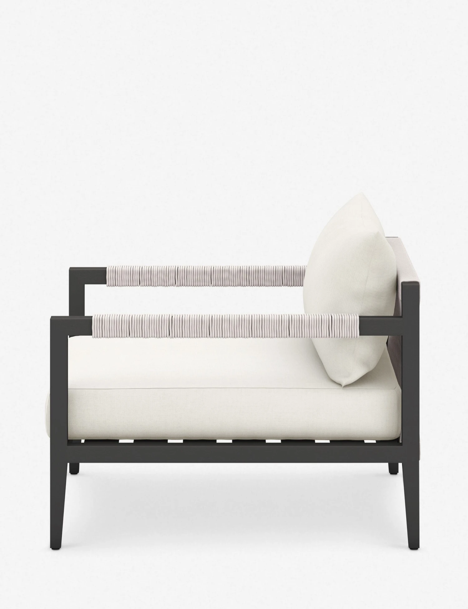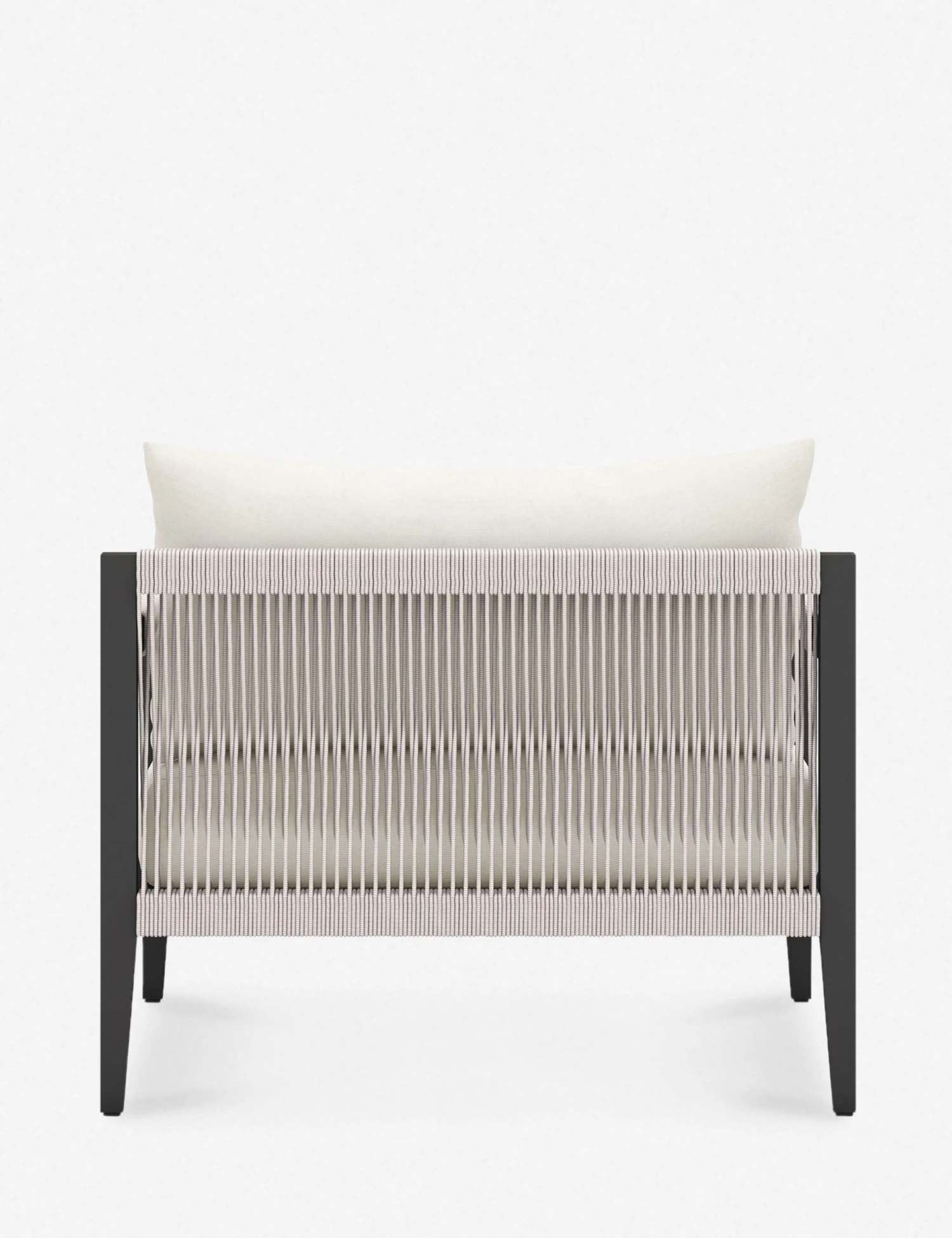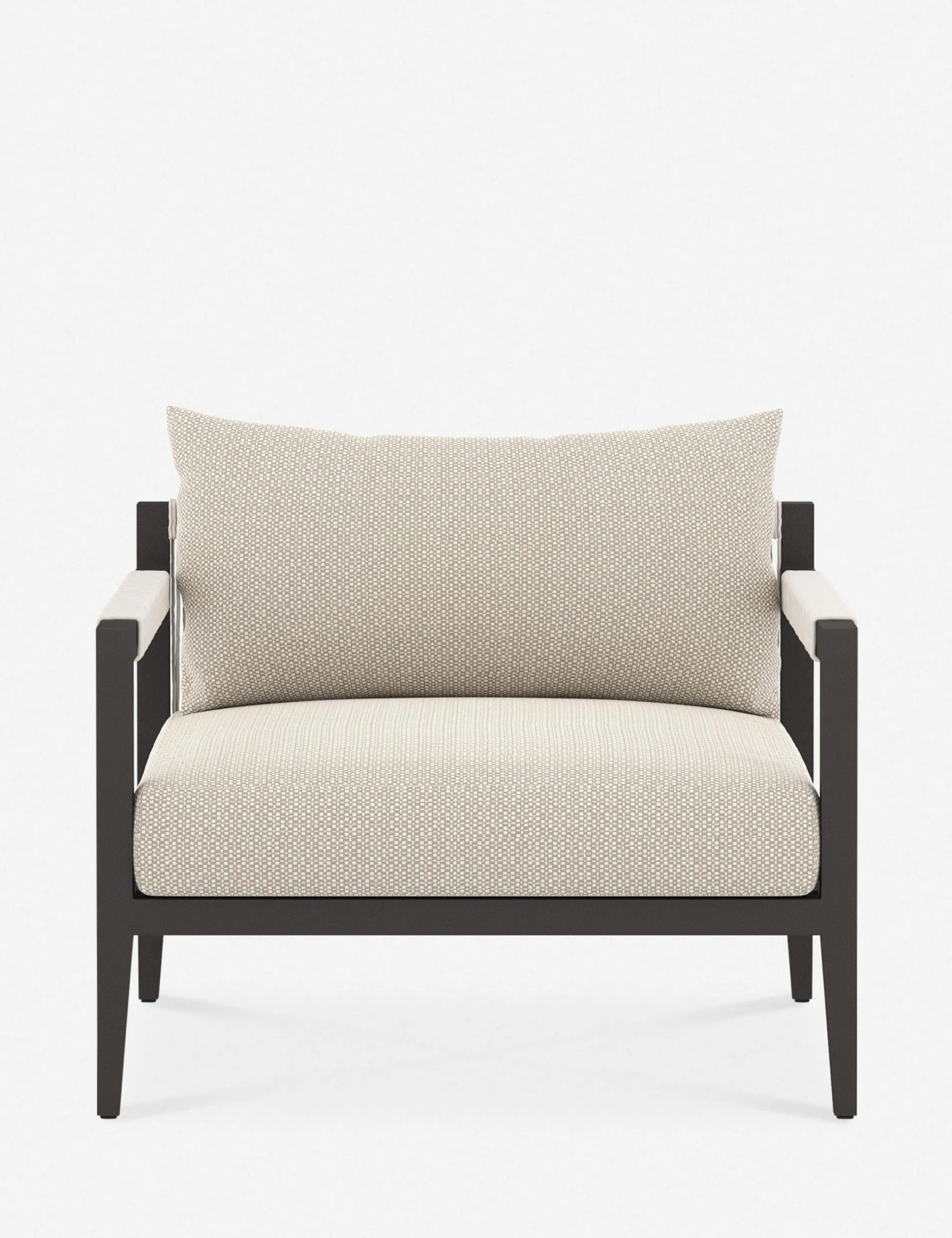 A slim, linear frame is complemented by plush cushions and woven detailing in this accent chair. The performance fabric upholstery is durable, fade-resistant, and easy to clean. We love the idea of using this occasional chair to relax poolside, on your terrace, or even in your sunroom.