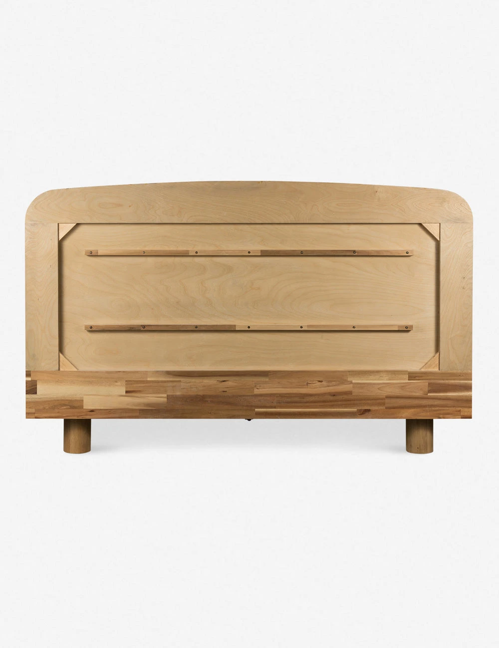 Bring a dramatic edge to your bedroom set with the Cyrus Collection. Clad in an oak veneer burnished to highlight its beautiful natural grain, this bed frame sits on chunky cylinder legs setting off a unique silhouette. The contrast of the clean-lined frame with the subtle curve of the headboard offers versatile style appeal.