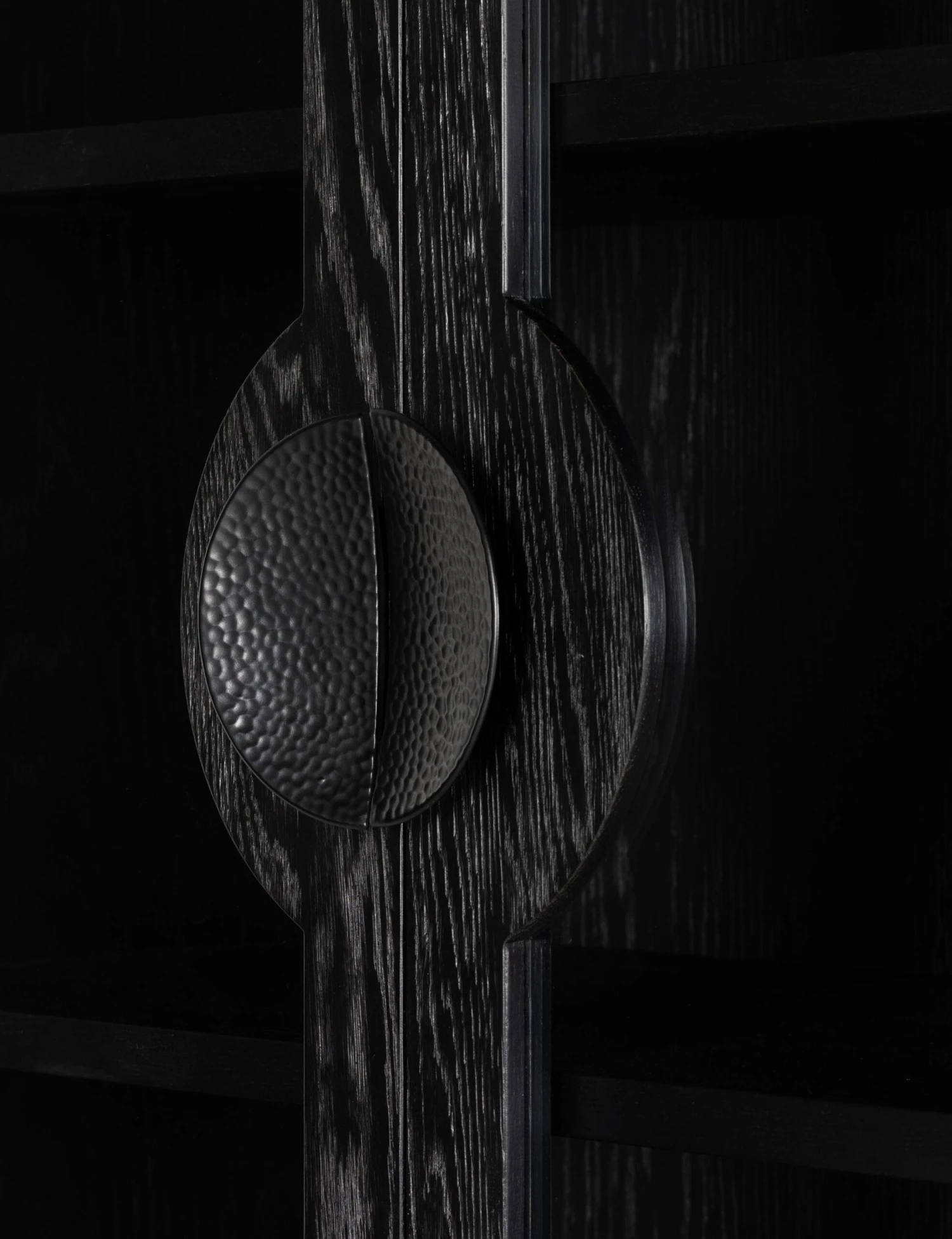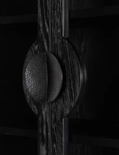 With its sleek oak frame finished in black, this curio cabinet is the perfect showcase for a rich and moody aesthetic. The cabinet’s glass-paneled doors feature rounded iron handles with a hammered detailing for added textural intrigue. Fill with your favorite decor, dishes, or books for a stunning display.