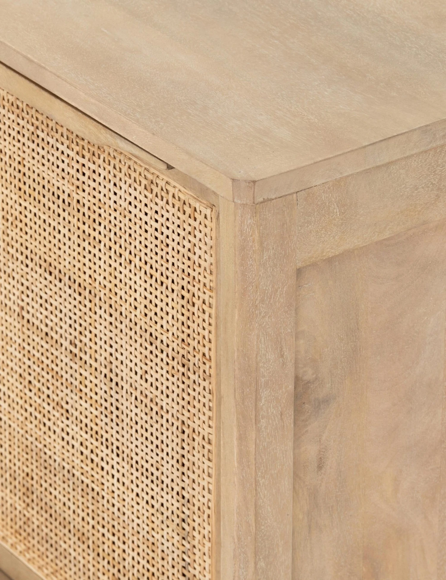 Clean lines and an airy profile bring a cool coastal feel to the Hannah nightstand. We love the classic touch of the woven cane front for its natural texture and warmth. This small nightstand features cabinet storage with an interior shelf to your bedside squared away—make sure to purchase a left or right-side design depending on which side of the bed it will placed on.