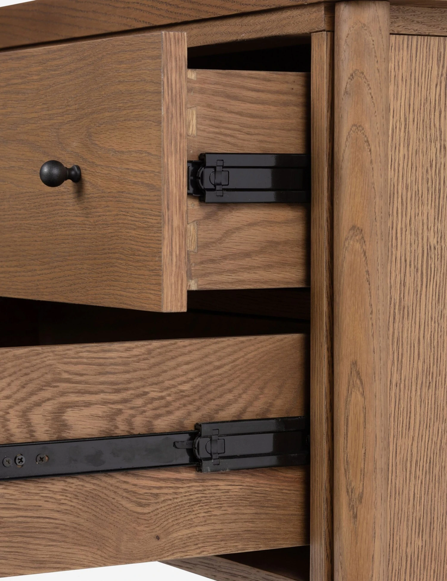 The Kisner nightstand brings transitional appeal to oak. Rounded legs hold a clean-lined frame in a warm finish that showcases the natural grain. Two spacious drawers bring ample storage to this modern nightstand.