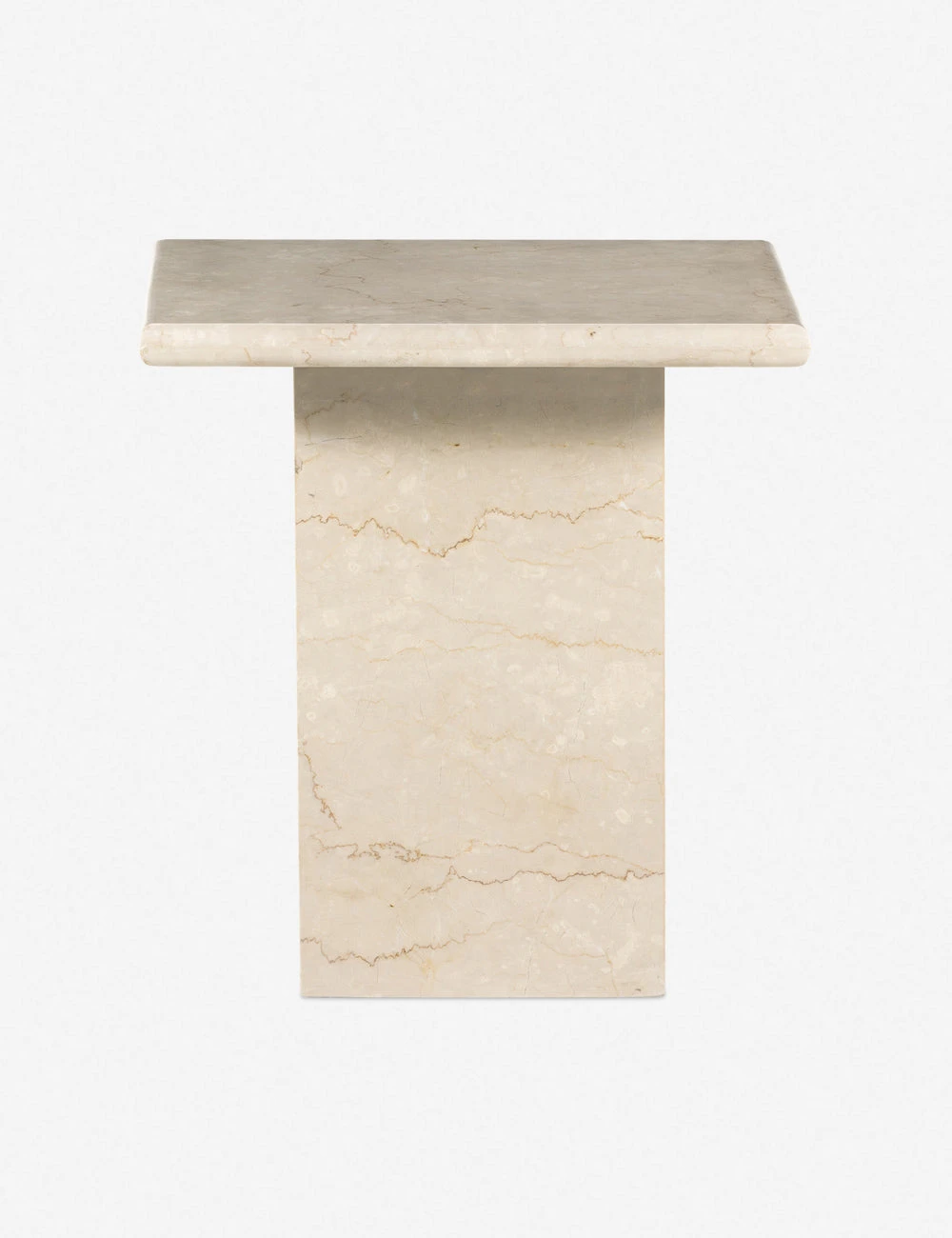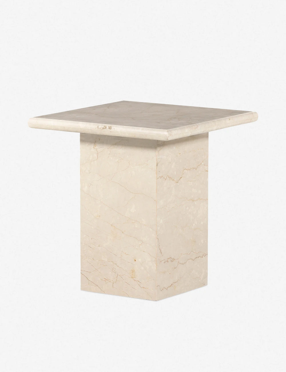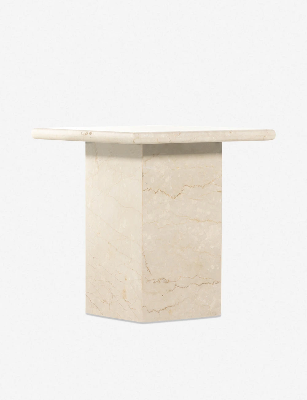 Clean edges and luxe materiality evokes notes of retro Italian design in this solid marble side table. The cream coloring offers a soft tone to the polished edges inspiring a look of crisp modernity to accent your space. Style this end table for an elevating accent piece.