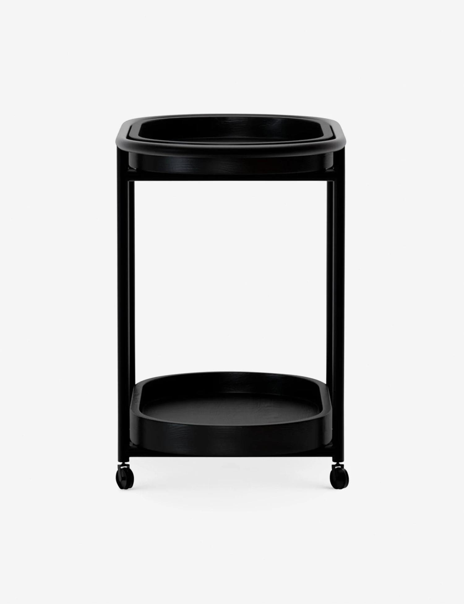 A steel tube frame holds two oak tray shelves in this simply stylish bar cart. This versatile design offers mixed-material appeal in a finish to suit your look. Plus, the casters let you float your bar anywhere in your space when you’re entertaining to bring a dynamic touch.