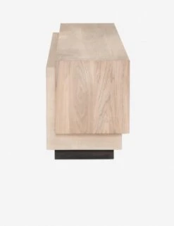 Inspired by stately Italian design, the exaggerated silhouette of this media console offers room-defining style. Its blonde-finished walnut veneer case seemingly floats atop its blackened iron legs, with pale oak veneer door fronts adding rich definition. A spacious interior comes with shelving to offer plenty of room for media storage as well as rear cutouts.