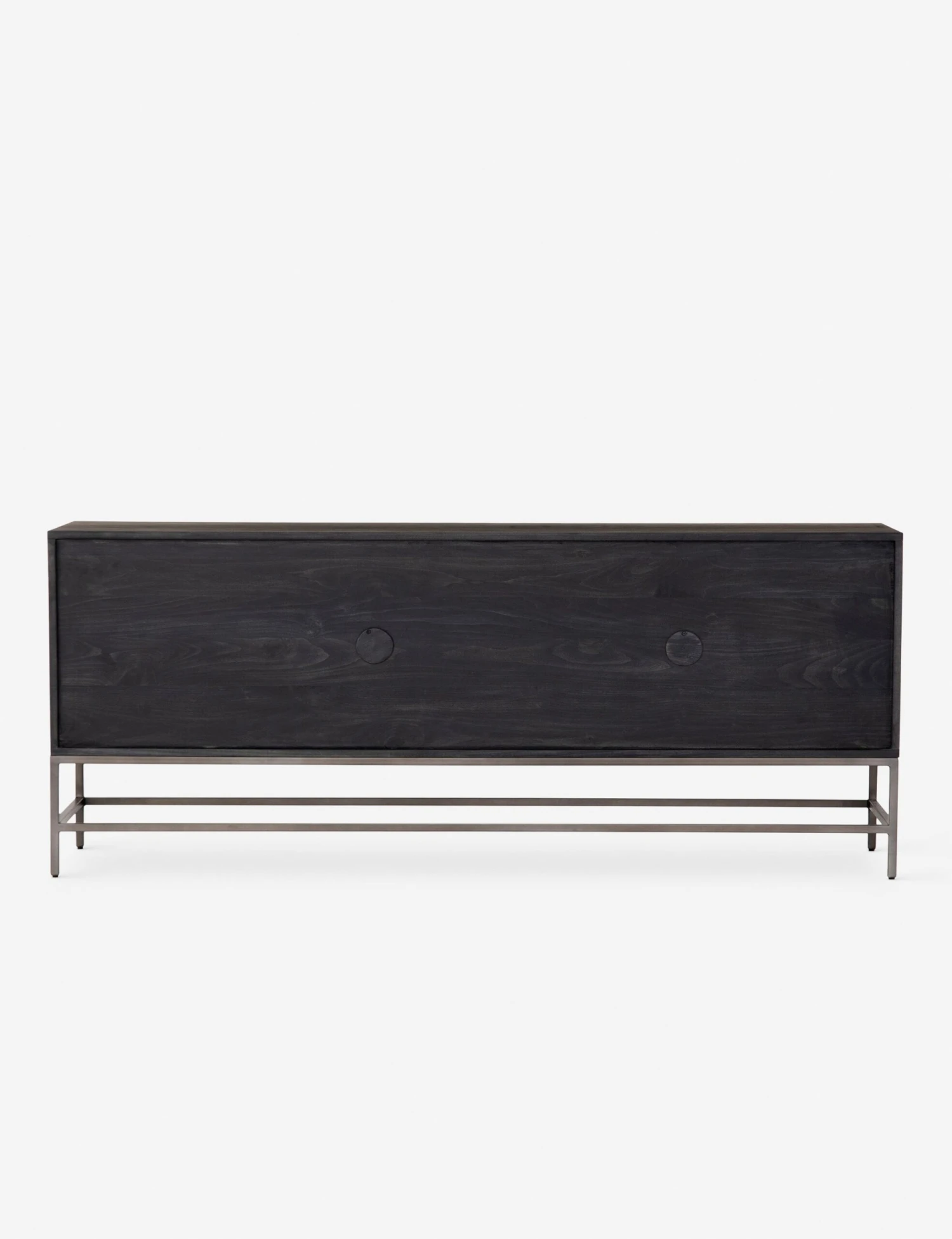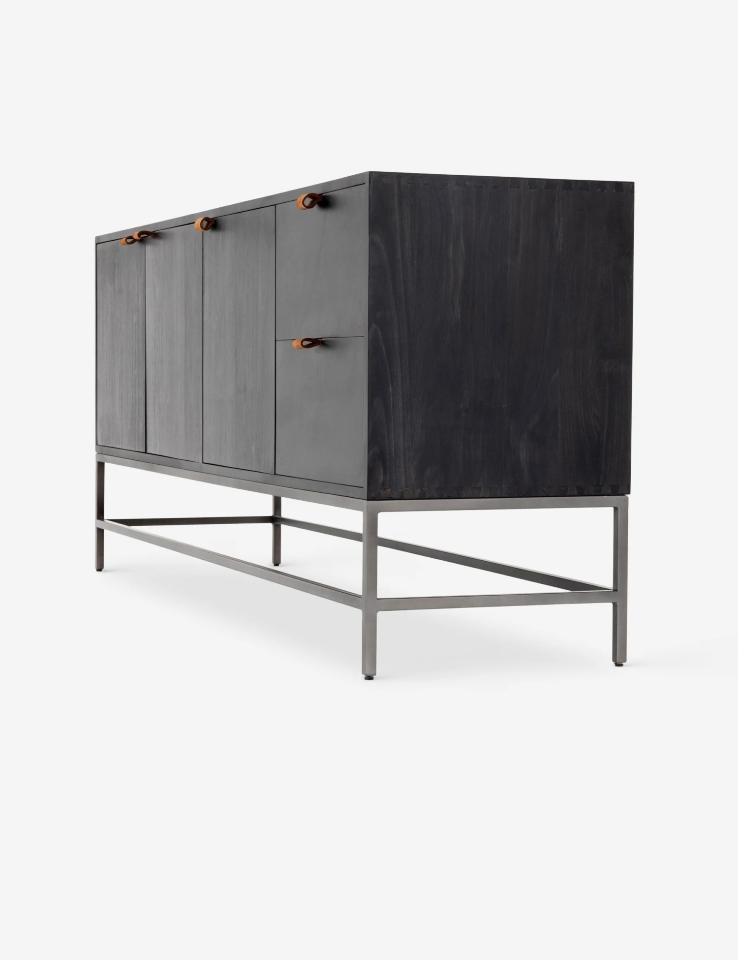 Keep your style grounded (and super organized) with this wooden sideboard cabinet. Features elements of mid-century aesthetics like a black wash, slim iron base, and top-grain leather pulls.