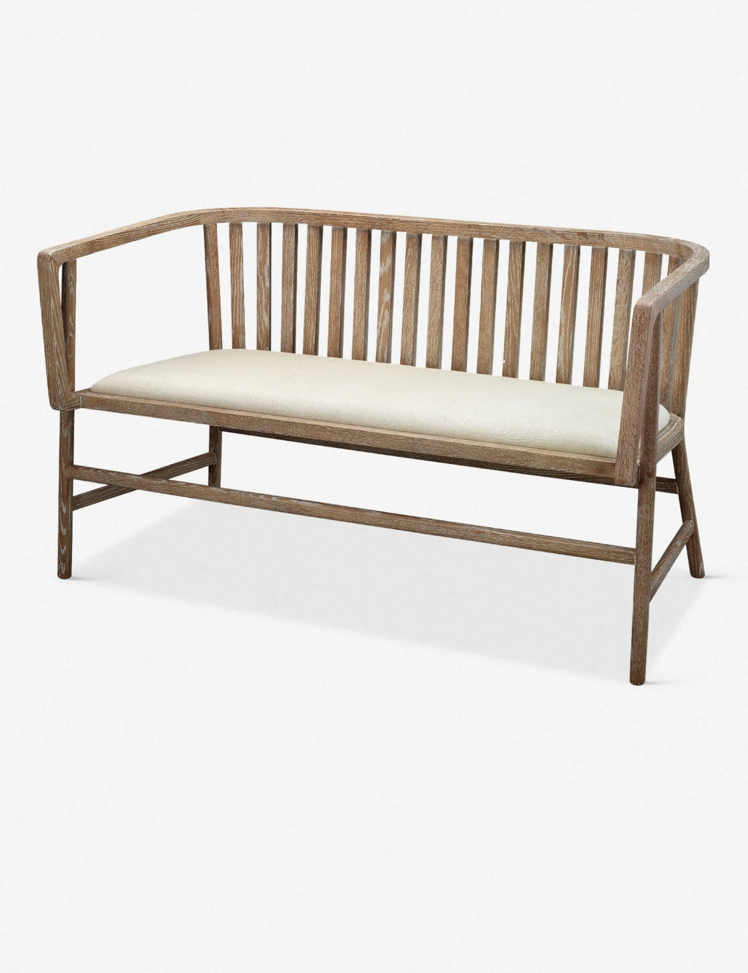 A classic farmhouse-favorite loveseat with a few modern updates. A grey-washed wooden frame, off-white linen upholstery, and an updated arm design makes this accent settee a must for eclectic living rooms.
