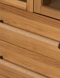 A stately oak-clad cabinet with glass paneled doors for storage and display. The soft close drawers feature iron pulls wrapped in cord for added texture. Whether stashing linens and dishes in a small-space dining room or adding character to a casual lounge, this tall curio cabinet is a versatile addition for transitional decor.
